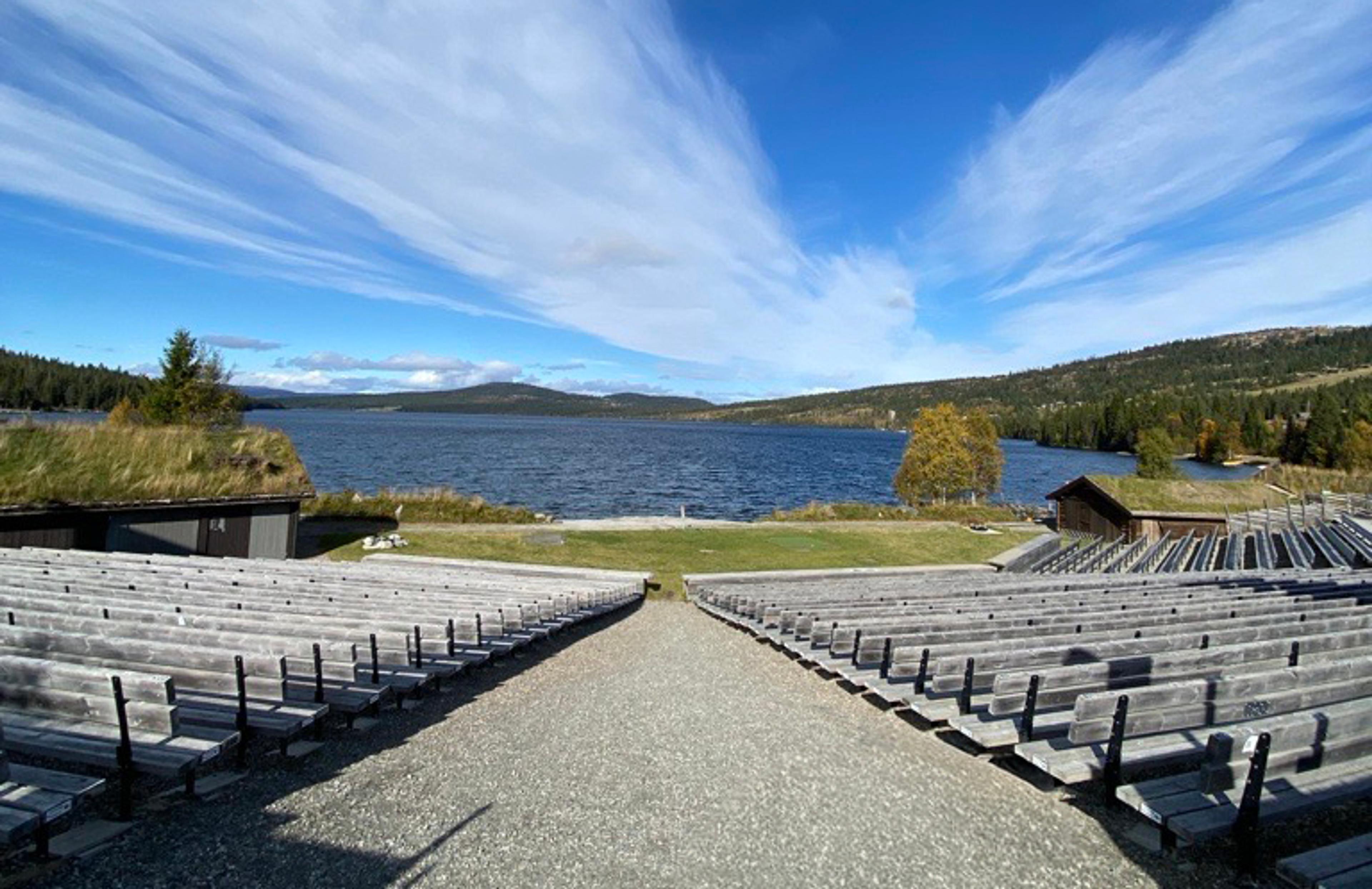 Portene inn til amfiet er åpne, og du er velkommen inn! Ta plass, nyt utsikten utover Gålåvatnet og spis gjerne medbragt nistepakke.